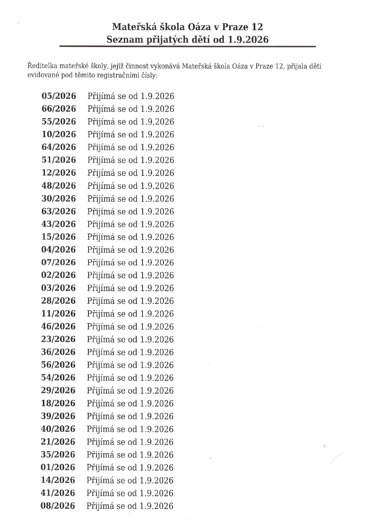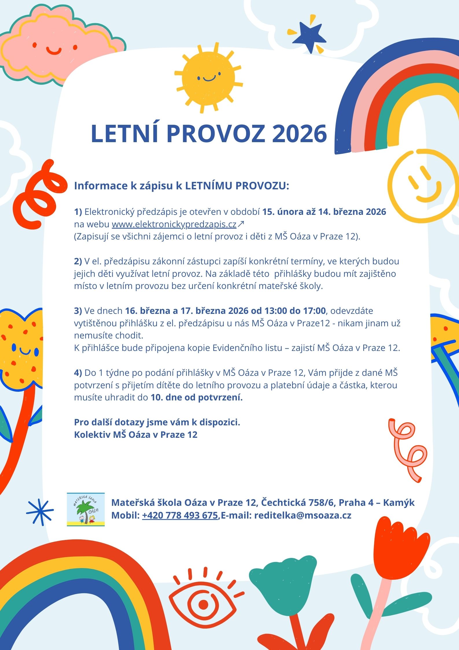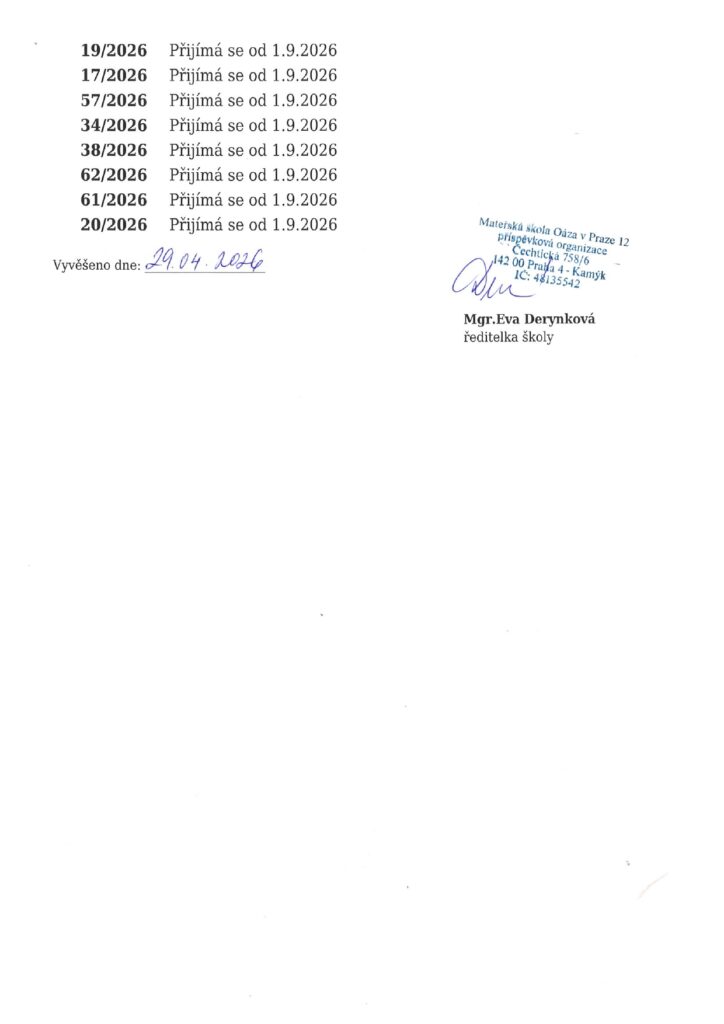 Aktualitya důležité informace Zde můžete nalézt všechny aktuality, novinky a důležité informace. Více Aktivitya kroužky 1. Anglický jazyk 2. Tanec 3. Čj pro předškoláky s OMJ 4. Plavání 5. Sportovky Více Režim dne Podívejte se na obvyklý denní program. Více https://www.msoaza.cz/wp-content/uploads/2024/07/Jak-to-u-nas-v-Oaze-vypada.mp4 MŠ Oáza v Praze 12 používá aplikace „Naše MŠ“, kde naleznete aktuální informace, jídelníček, fotogalerii, sekci omluvenky apod.