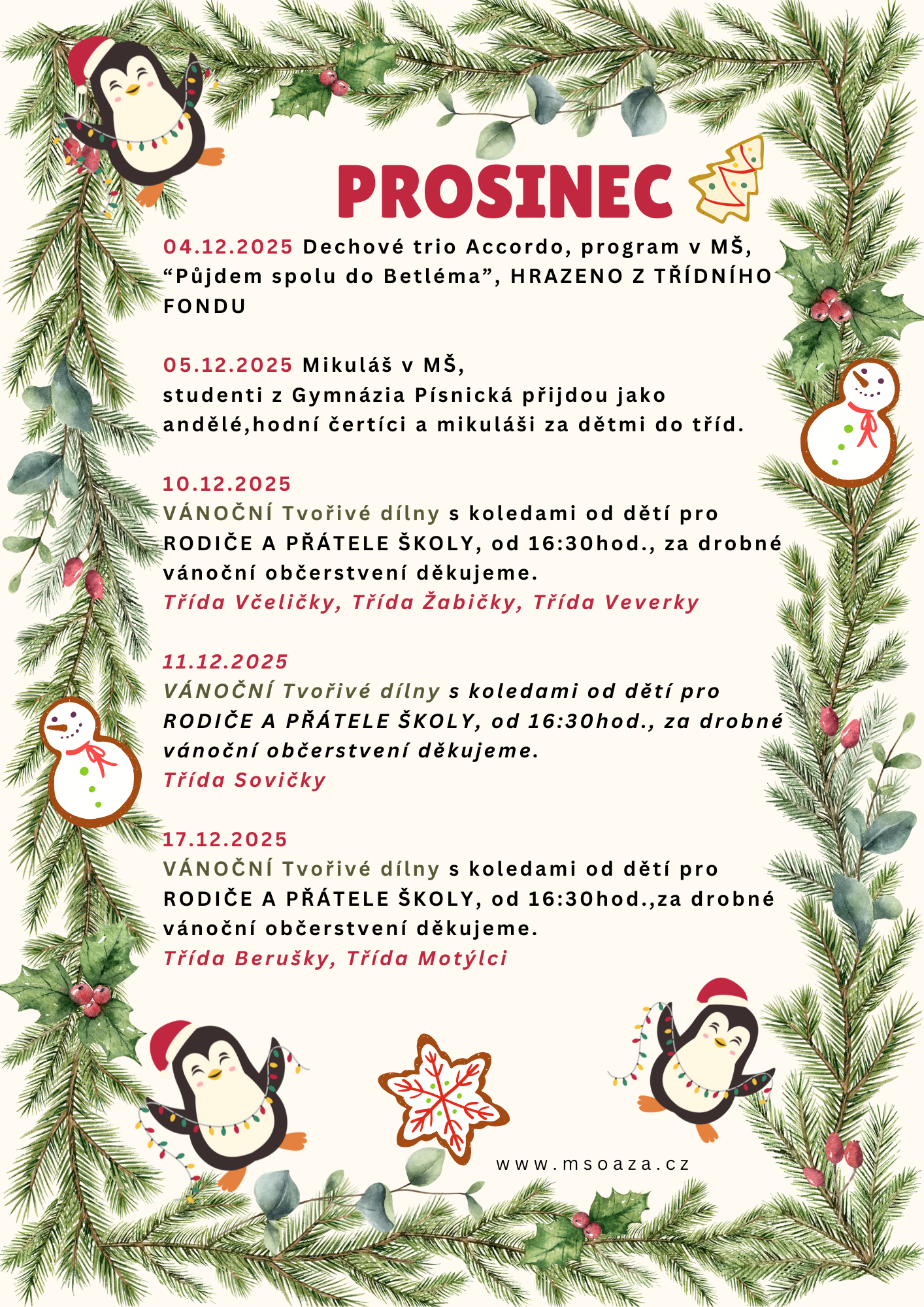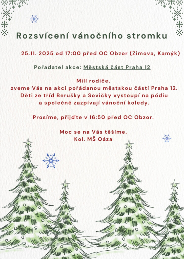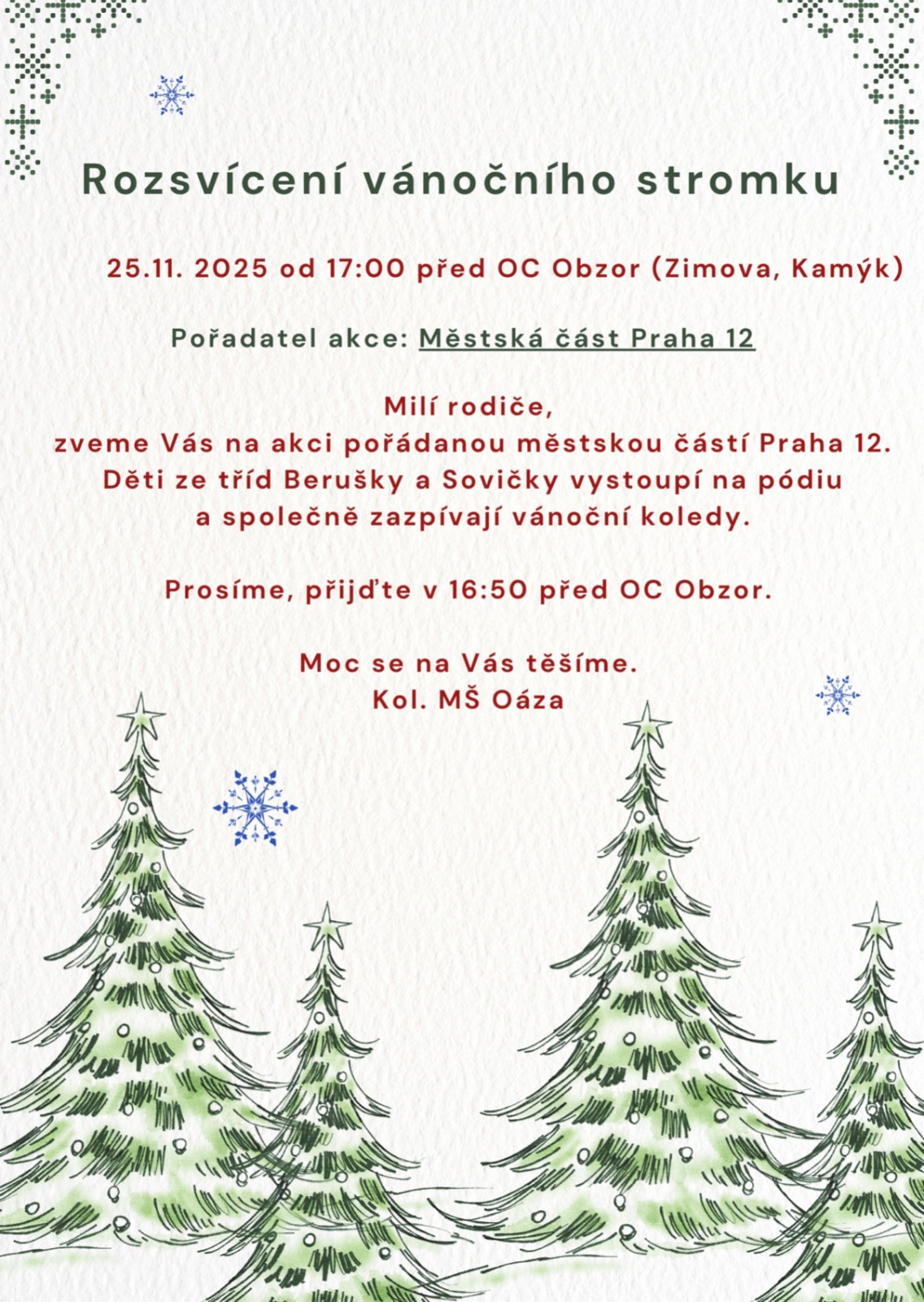 Aktuality Rozsvěcení vánočního stromu Prahy 12 Brožura MŠ a ZŠ v Praze 12 Brožury „Přijďte se podívat“ pro ZŠ a MŠ v Praze 12 https://www.praha12.cz/brozury-prijdte-se-podivat-pro-zs-a-ms-v-praze-12/d-87153 Akce na prosinec Akce na prosinec Zamykání zahrady v MŠ Oáza Seminář pro rodiče od MČ Prahy12 Provoz běheme Vánoc a léta Akce na listopad Hranice s láskou Digitální svět dětí Akce na měsíc Říjen Akce na měsíc Září