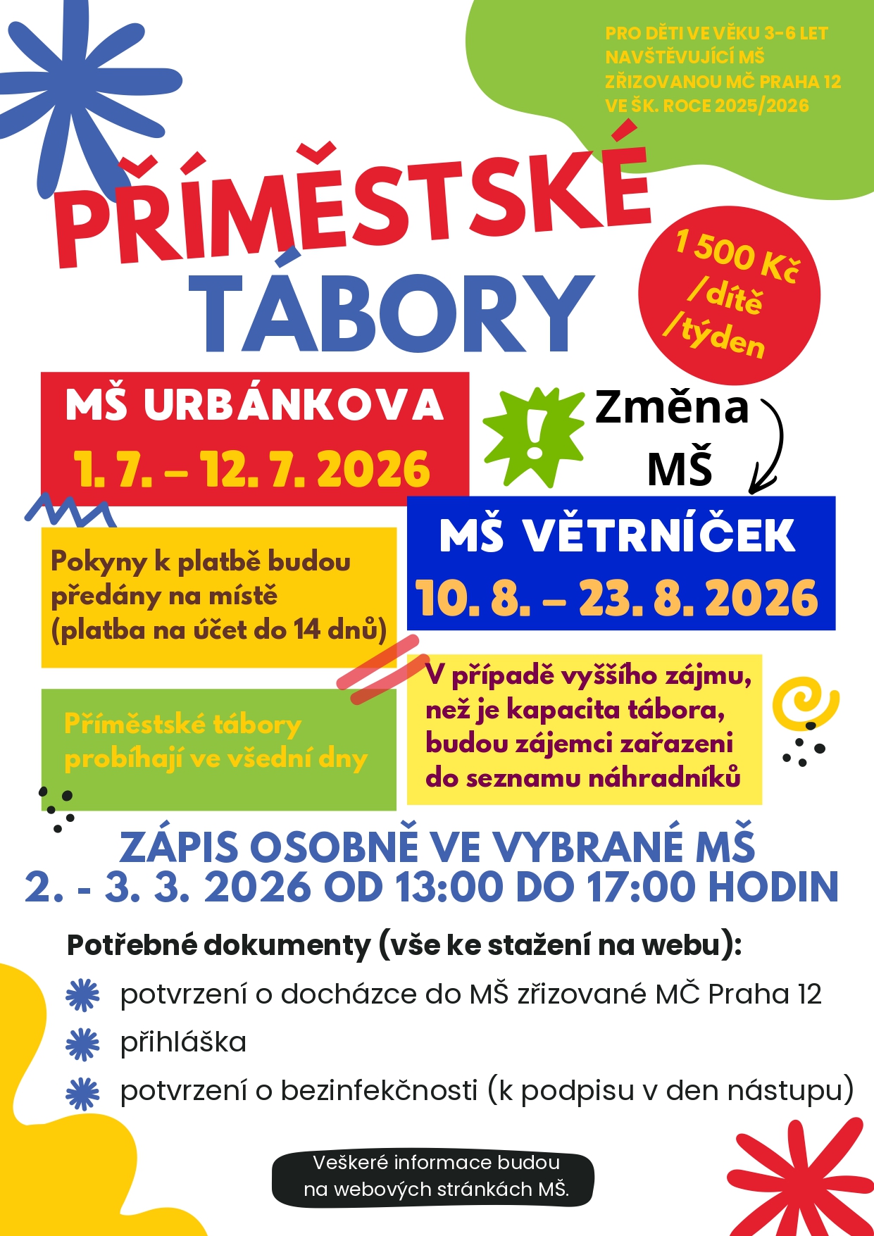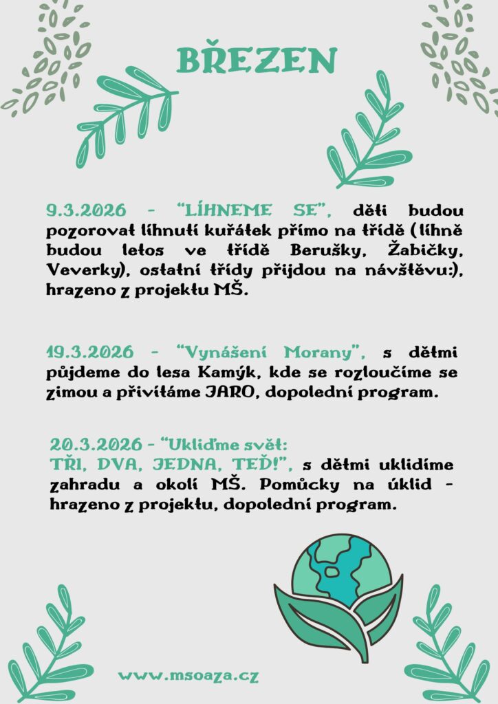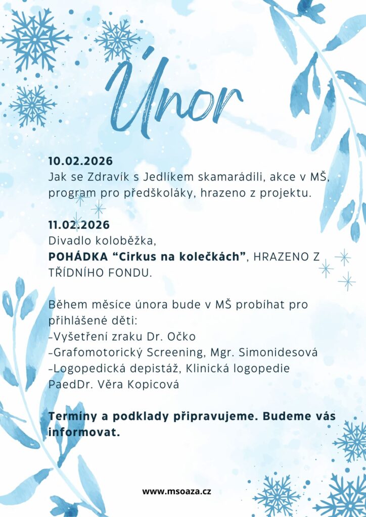Aktuality Akce na březen Letní provoz - změna MŠ Akce v únoru Informace k Letnímu provozu MŠ v Praze 12 Akce na leden 2026 Rozsvěcení vánočního stromu Prahy 12 Brožura MŠ a ZŠ v Praze 12 Brožury „Přijďte se podívat“ pro ZŠ a MŠ v Praze 12 https://www.praha12.cz/brozury-prijdte-se-podivat-pro-zs-a-ms-v-praze-12/d-87153 Akce na prosinec Akce na prosinec Zamykání zahrady v MŠ Oáza Seminář pro rodiče od MČ Prahy12 Provoz běheme Vánoc a léta Akce na listopad Hranice s láskou Digitální svět dětí Akce na měsíc Říjen Akce na měsíc Září